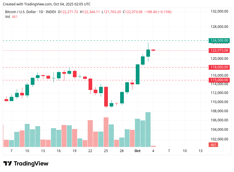 BTC > 124K = breakout territory; under 118K = momentum risk