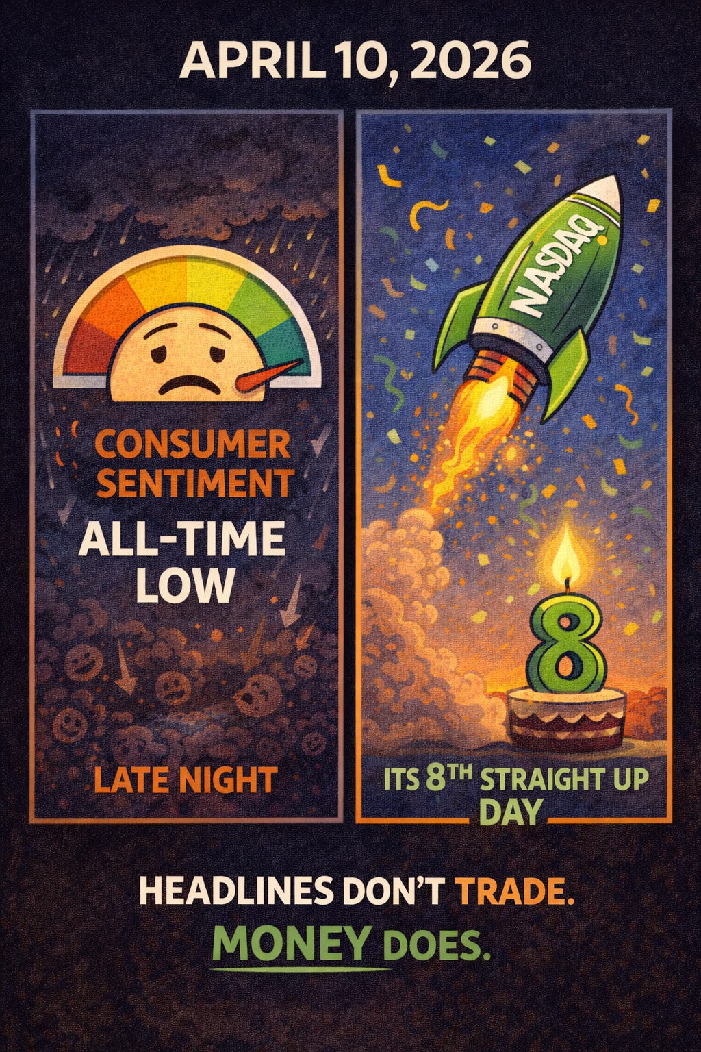 Friday delivered the week’s actual verdict in two data points issued four hours apart. At 8:30 AM, CPI printed 3.3% year-over-year -- the largest annual jump since April 2024, driven almost entirely by a 21.4% surge in gasoline prices during March. At 10:00 AM, the University of Michigan Consumer Sentiment Index printed 47.6, an all-time low in a series that dates to 1952. Consumers expect inflation to accelerate further over the next 12 months. The Nasdaq closed up 0.37%. It was its eighth consecutive winning day.
