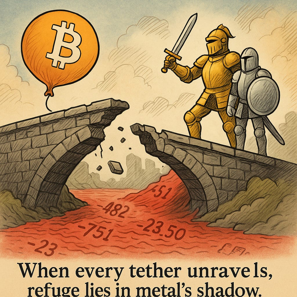 Yet even in this bleed, metals held up better. Gold rallied, silver firmed. Capital rotated into safer stores of value. The narrative is clear: where belief breaks, metal often becomes the default shelter.