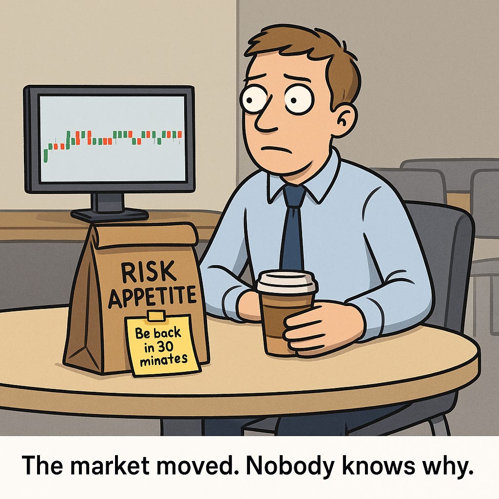 Today’s action felt like the market checking its boots before walking outside. No cheers. No panic. Just a quiet pull-up of the collar and a squint at the weather. Risk is tentatively tolerated again, but trust levels remain low. Until yield and policy align, we trade for flexibility, not conviction.