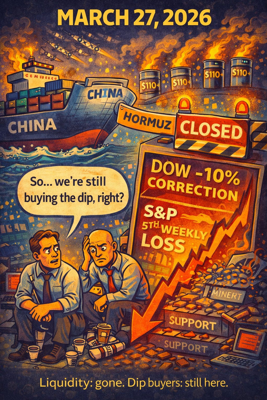 It’s Friday. There are no talks. The strait is more closed than it was when the war started. Chinese ships are being turned back by the country that promised them safe passage. The Dow is in correction. The Nasdaq is in deep correction. The S&P just posted its fifth straight weekly loss, a streak it hasn’t managed since Russia invaded Ukraine. The 82nd Airborne is deploying. 10,000 more troops are being considered. 850 Tomahawks have been fired. China is retaliating with a trade probe. The Fed is “apprehensive.” And the president of the United States is extending deadlines based on gifts that get revoked within 48 hours of being received.