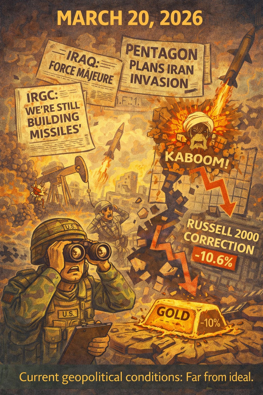 There is a particular kind of dark comedy that only markets can produce, and Friday delivered a concentrated dose. Iraq declared force majeure on its entire oil export infrastructure while the country that caused the blockade is simultaneously having its sanctions lifted so its oil can be sold to the world at a discount to cover the supply gap created by the war. Iran’s military spokesman went on television to insist his country was still building missiles, threatened to bomb theme parks, and was killed by an airstrike before the ink was dry on the transcript. Gold, the investment thesis that has survived the fall of Rome, two world wars, and the invention of cryptocurrency, just posted its worst week since Reagan was new and Thriller was on the charts, during a conflict that should, by every historical measure, be sending it to the moon. And the Pentagon is drawing up plans to seize an island that handles 90% of Iran’s oil exports, using Marines who deployed three weeks ahead of schedule, funded by $200 billion in emergency appropriations that Congress hasn’t approved yet, all in service of opening a waterway that Iran can close again by flipping a switch.