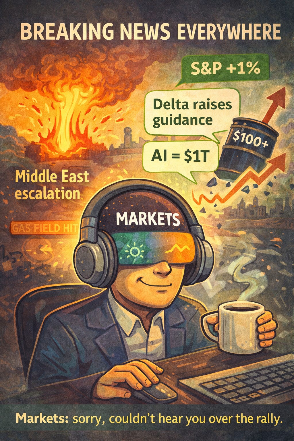 Israel Killed Iran's Top Security Official, Iran Struck a UAE Gas Field, Oil Went Back Above $100, the S&P Went Up Anyway, and Delta Raised Guidance Because Apparently People Are Panic-Booking Fligh