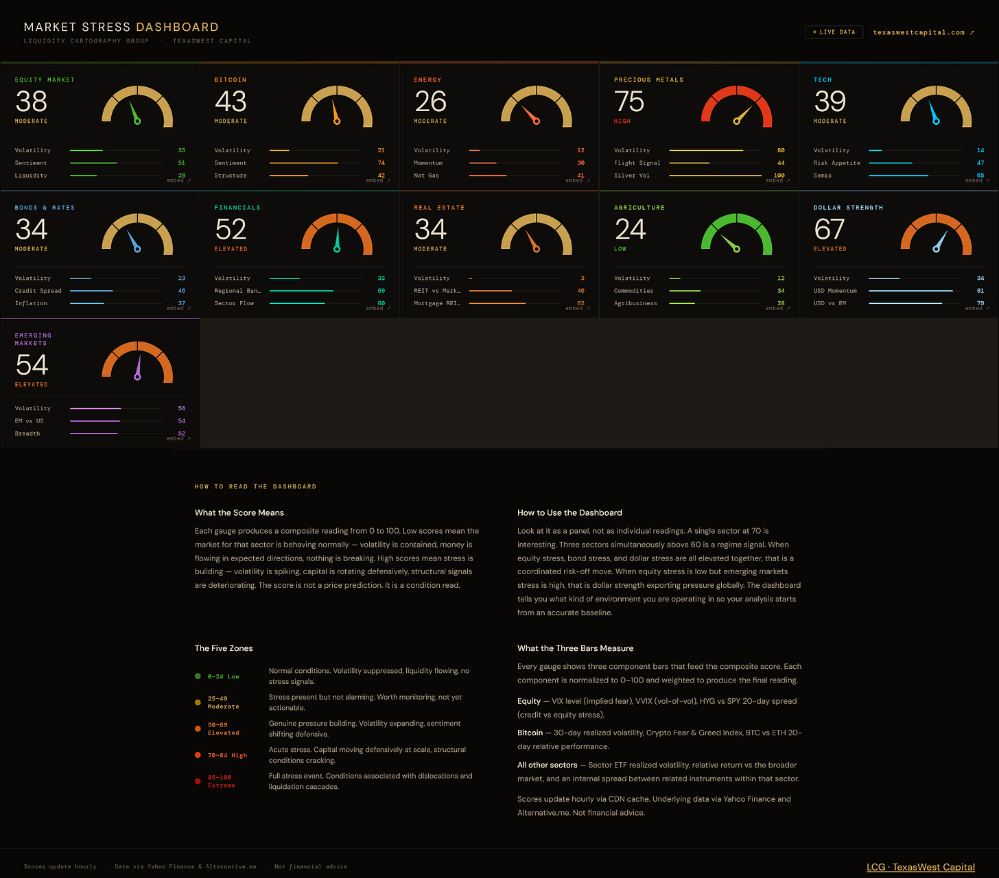 The LCG Market Stress Dashboard is live at marketstress.texaswestcapital.com. Eleven real-time gauges covering equity markets, Bitcoin, energy, precious metals, tech, bonds and rates, financials, real estate, agriculture, dollar strength, and emerging markets. Each one aggregates volatility, sentiment, and structural signals into a single score — updated daily, readable in under three seconds.