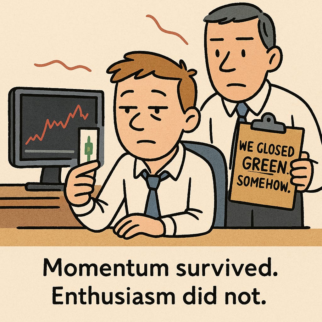 Today’s green feels like turning on a flashlight in a dark room; not enough to light the place, but enough to see where the furniture is. The rally is crawling back inside, not marching. Participation is fragile. Strength is absent. Until price and psychology align, treat the tape like a guest on parole: welcome it if you want, but don’t get cozy.