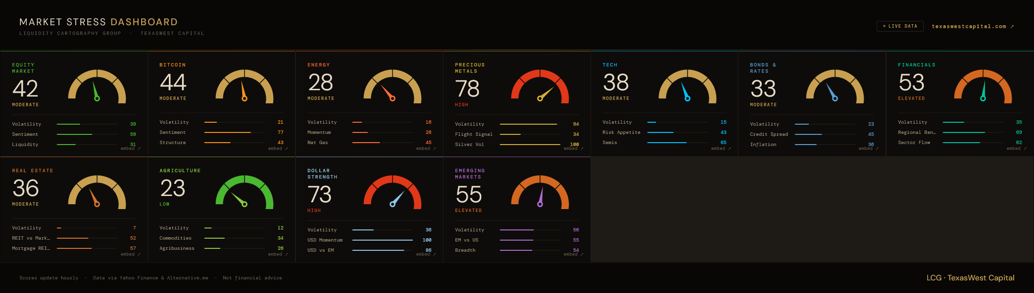 The LCG Market Stress Dashboard is live at marketstress.texaswestcapital.com. Eleven real-time gauges covering equity markets, Bitcoin, energy, precious metals, tech, bonds and rates, financials, real estate, agriculture, dollar strength, and emerging markets. Each one aggregates volatility, sentiment, and structural signals into a single score — updated daily, readable in under three seconds.