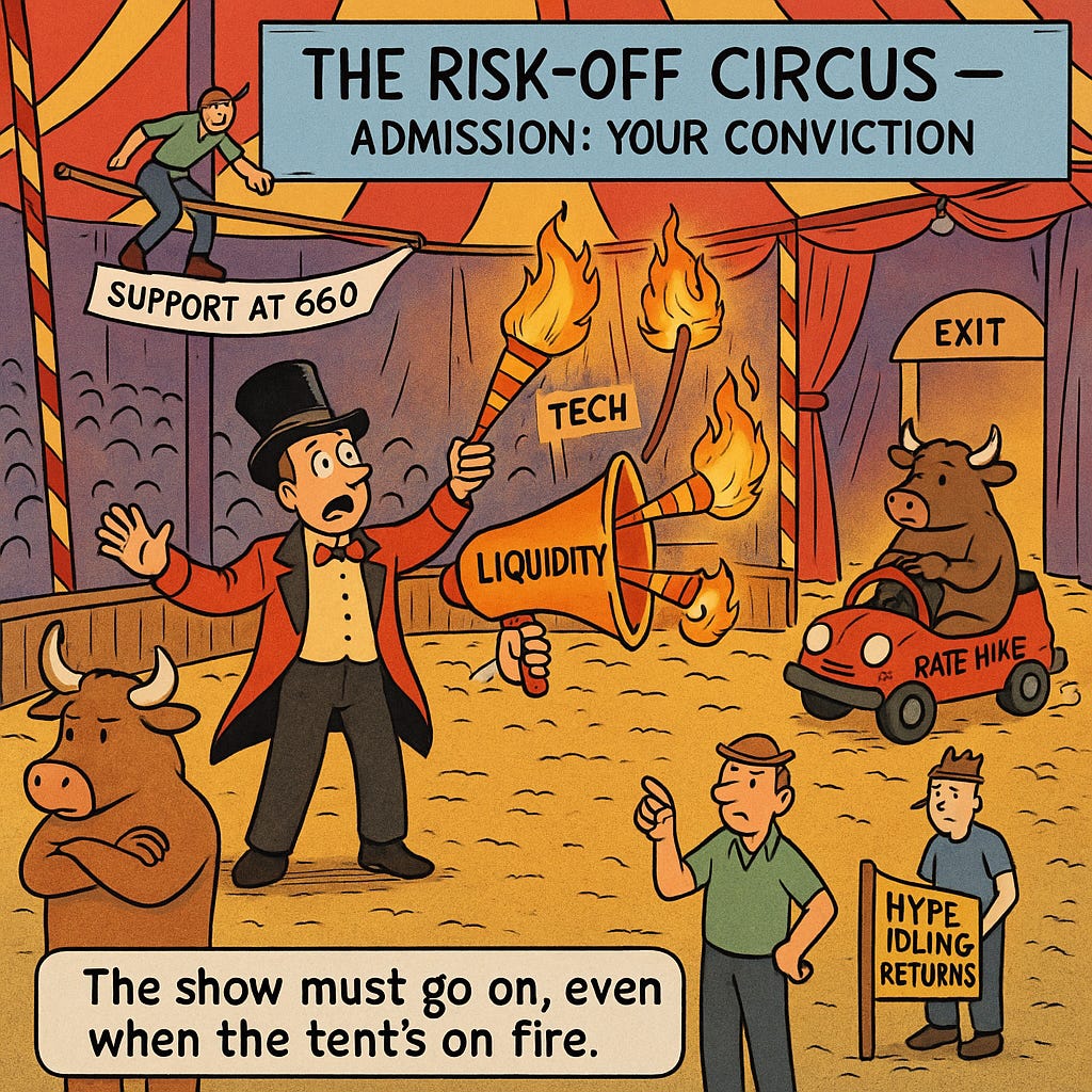 Today felt like a car revving in neutral. Engines loud, motion absent. Liquidity is present but not deploying. Tech and chip sectors lead the decline and when the parade’s baton drops, the float stops before the crowd notices. This era’s rally isn’t propelled by new fundamentals; it’s by old stories getting rewound. And when the narrative loops again, the pendulum swings.