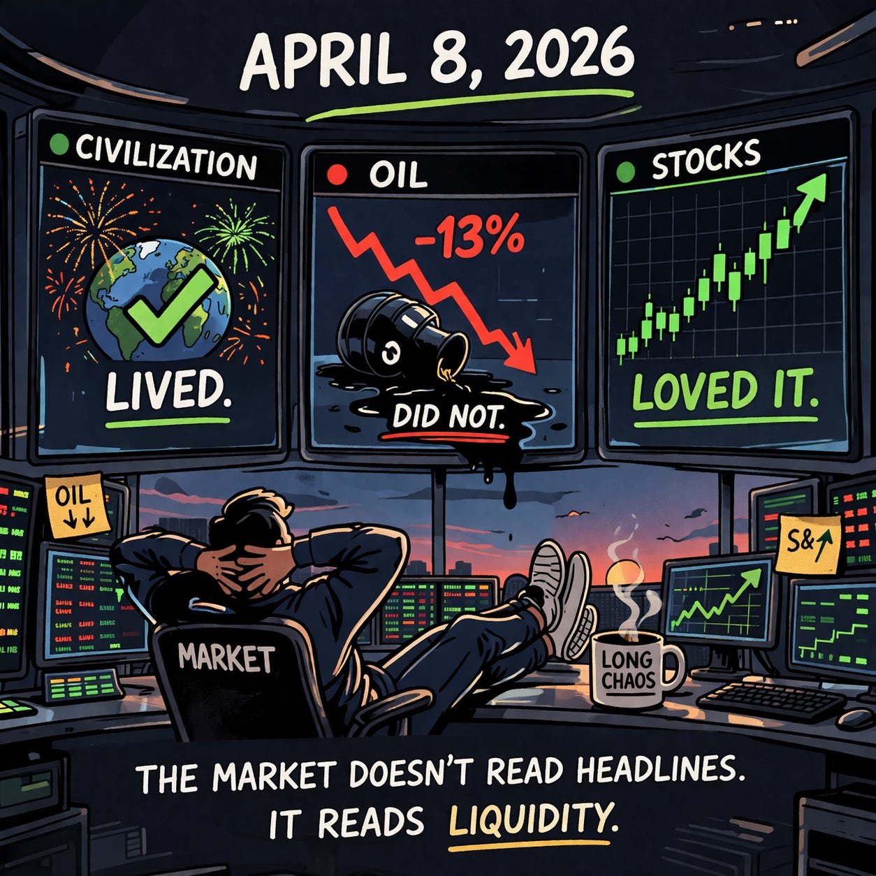 Forked Feed says: The Civilizational Pause ended because the civilization was not destroyed. The market went up 2.5%, the VIX crashed 18%, and everyone bought Delta Air Lines on the logic that $94 oil is better than $114 oil for jet fuel, which is correct, and that the ceasefire is durable, which the Vice President confirmed it is not. The Observer’s current classification: relief rally with a two-week expiration date, a counterparty that is actively lying about the terms, and a sequel scheduled for Friday in Pakistan.