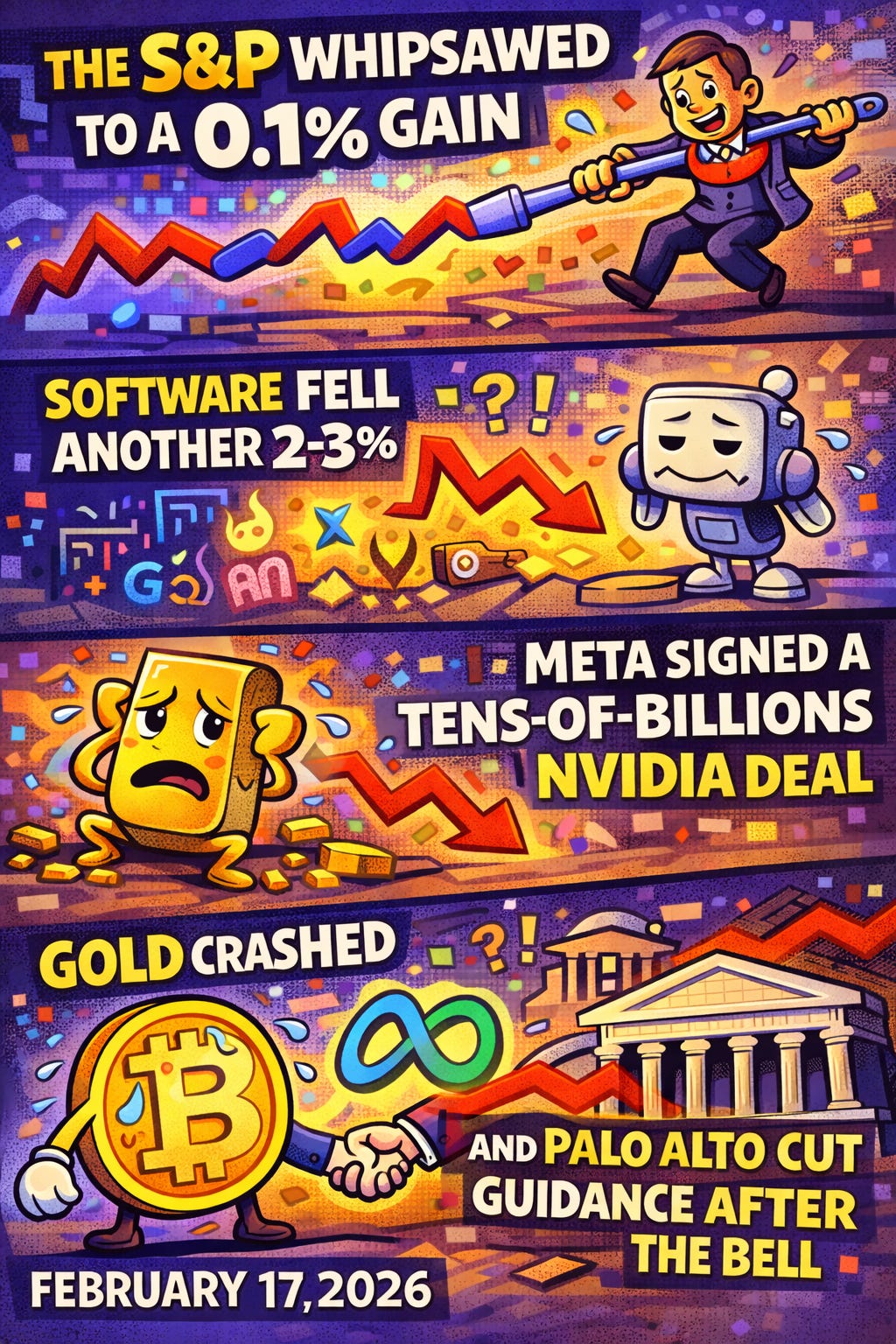 The S&P whipsawed to a 0.1% gain, software fell another 2-3%, gold crashed 3%, Meta signed a tens-of-billions Nvidia deal, and Palo Alto cut guidance after the bell.