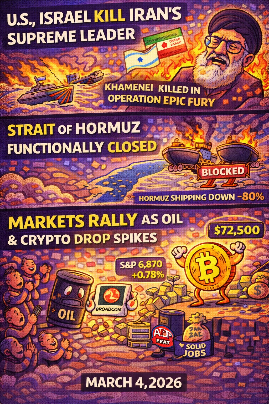 S&P rose 0.78% to 6,870 as oil pulled back from its spike. Khamenei killed in Operation Epic Fury. Hormuz shipping down 80%. BTC topped $72,500. Broadcom beat after hours. ADP jobs solid.