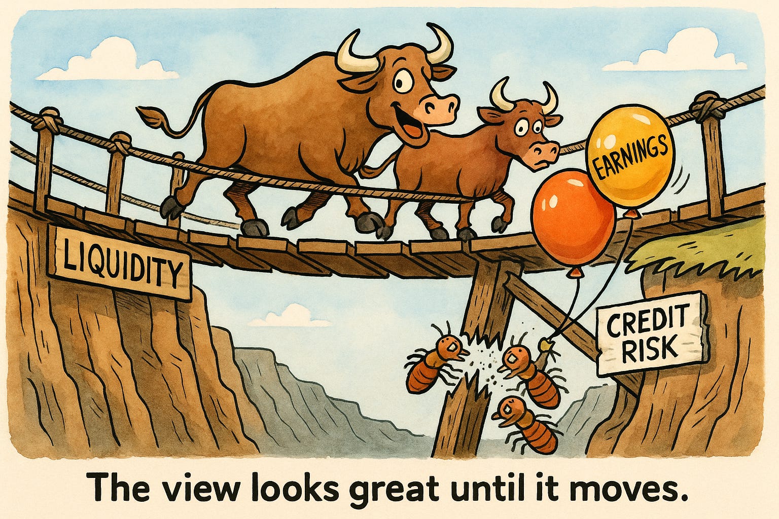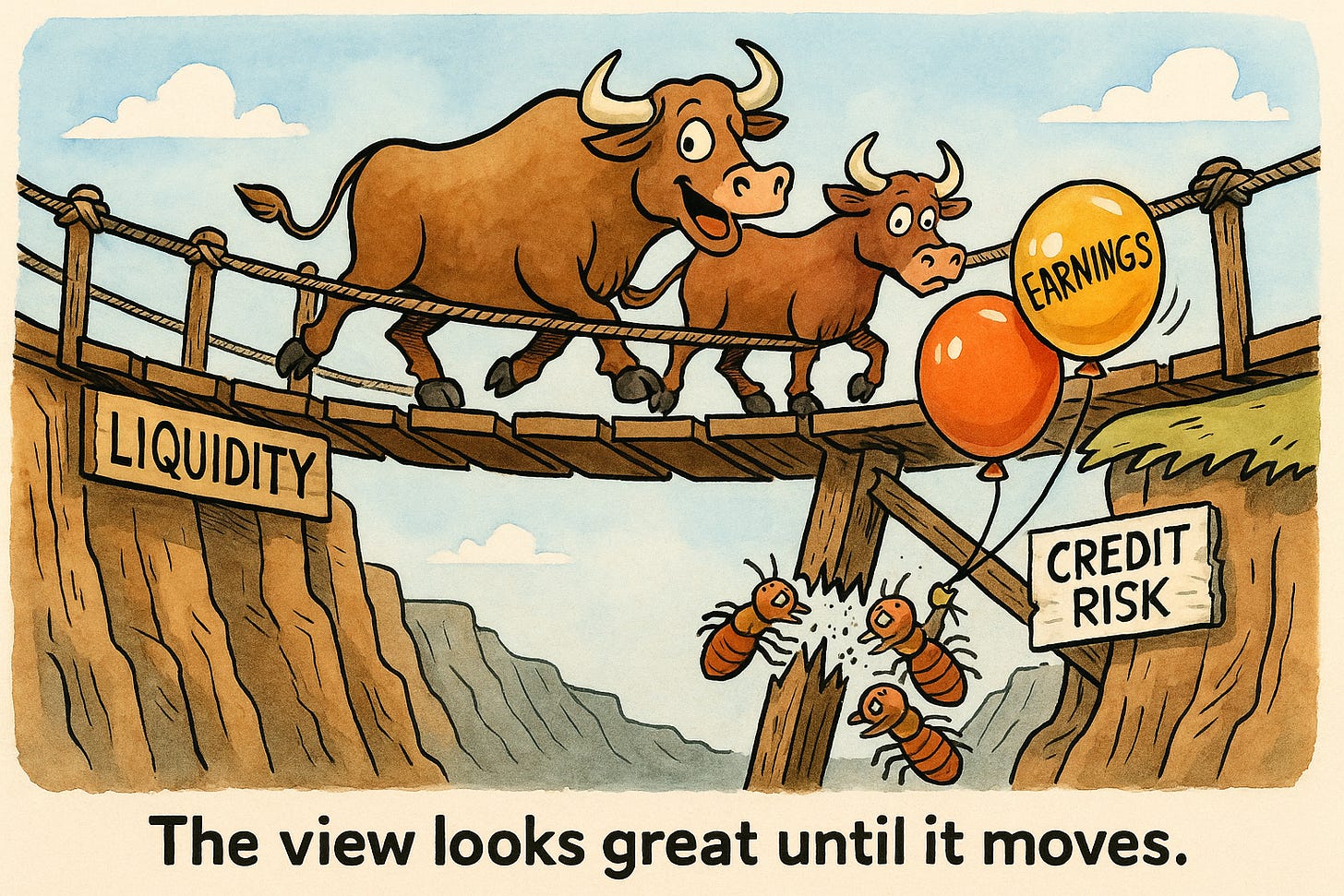 - Financials / Credit-sensitive: Banks mixed, credit remains a latent risk.