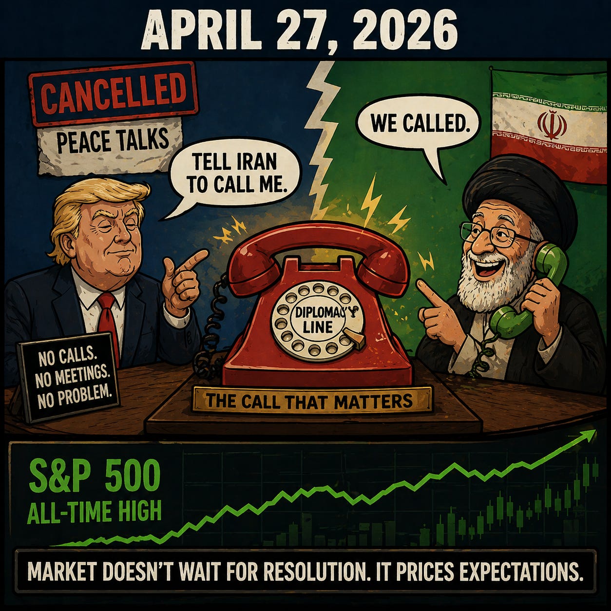 An all-time high produced by Iran submitting a proposal two days after Trump told them to call, which moves the Strait problem while deferring the nuclear problem, in a week that also contains four Mag 7 earnings reports and a potentially historic FOMC meeting. The Phone Call Rally is either the beginning of a genuine resolution or a very expensive confirmation that the market will celebrate any document that contains the phrase “reopen the Strait,” regardless of what the document leaves unaddressed. Wednesday will participate in settling that question.
