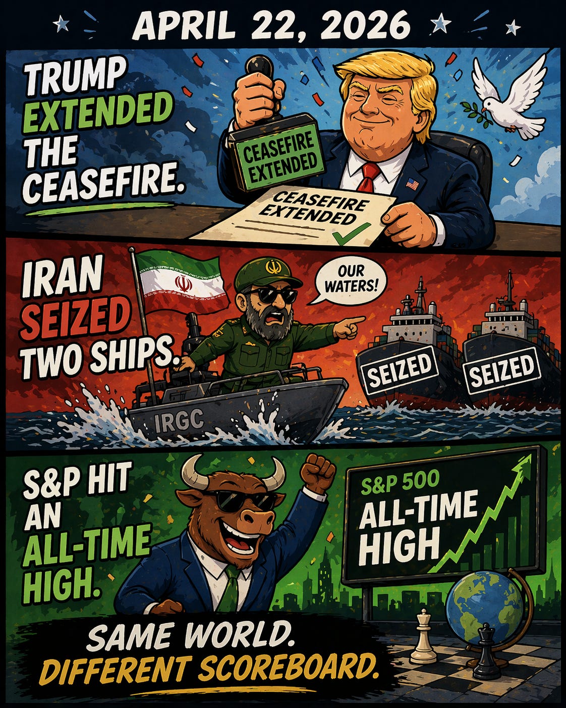 Forked Feed says: There’s a precise moment in the history of every doomed diplomatic arrangement when it becomes indistinguishable from a hostage negotiation conducted by two parties who are also actively taking each other’s hostages. Wednesday was that moment. The ceasefire was extended at midnight. Iran seized ships at dawn. The S&P 500 processed this sequence of events, determined that “extended ceasefire” was the operative phrase rather than “seized ships,” and closed 73 points higher at a new all-time record. The market has now demonstrated that it can price in peace and ship seizures simultaneously, which is either the most sophisticated risk assessment in financial history or evidence that someone left the autopilot running.