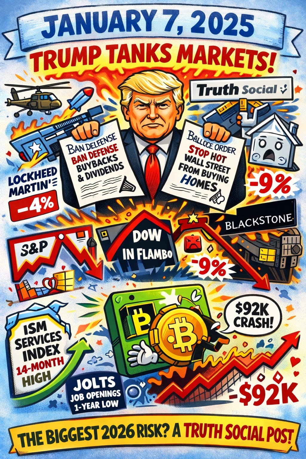 Day four of 2026. S&P 500 hit a record then closed red. Defense stocks banned from dividends. Blackstone dropped 9% on a post. ISM strong, JOLTS weak, ADP softer. Bitcoin back below $92,000. The economy is fine. The policy environment is chaos. Trade accordingly.