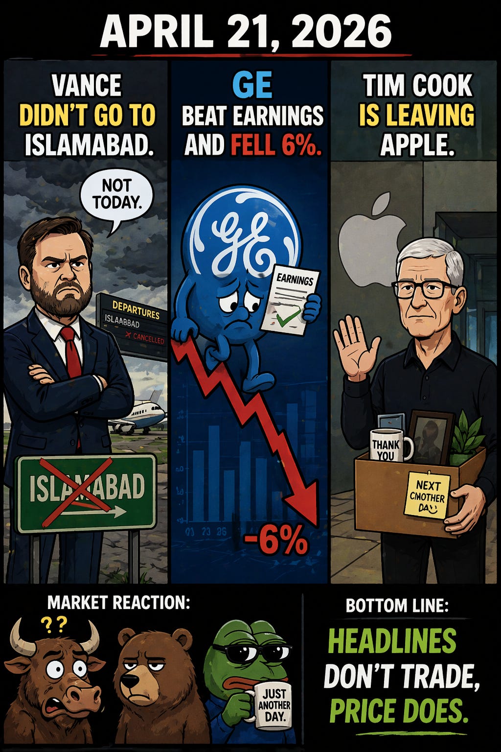 Vance Didn't Go to Islamabad. GE Beat Earnings and Fell 6%. Tim Cook Is Leaving Apple.